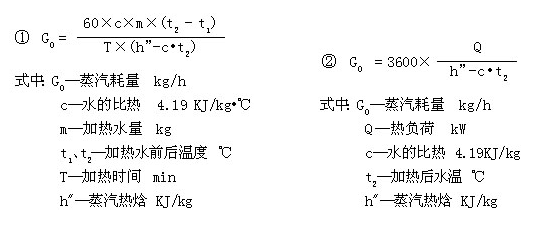 | DQJ浸沒式汽水混合加熱器有額定的蒸汽耗量指標,設計時根據實際所需要的蒸汽耗量,選用一臺或多臺浸沒式汽水混合器。實際所需蒸汽耗量可參照以下公式:(①用于間斷加熱;②用于連續加熱。)確定如下: |